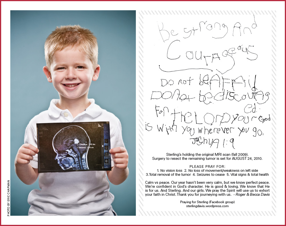 Our friends son Sterling who is 5 years old is checking into a hospital tomorrow for his second surgery that will happen on Tuesday to remove a brain tumor that continues to grow. I’ve spent the past year watching the Davis family and Sterling fight. They are brave. They are strong. They are noble. They are courageous. They are showing so many the struggles and joys of those that truly depend on the Lord for everything that they have and are. They are heroes in my eyes. I”m cheering them on. I’m just one of MANY people interceding on their behalf. Would you pray with them too?