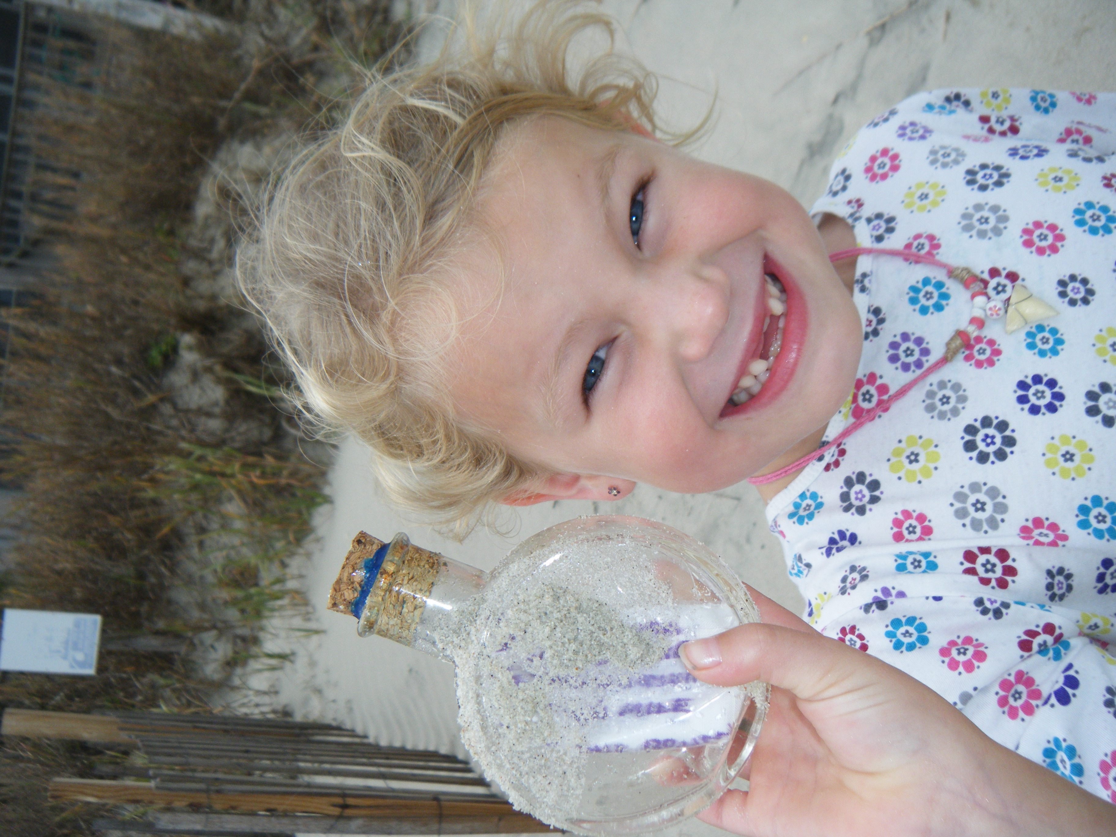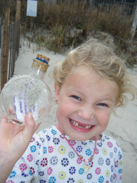 The rain is coming in.  I took the short window to get the kids to the beach today to get some energy out.  Decided a nice long walk would do.  On our way back Emma yells that she has found something.  What now I wonder?  She has found in the past few months – starfish, sand dollars,  shark teeth.  So why not a message in a bottle.  Seems so fitting she was the one to find it.