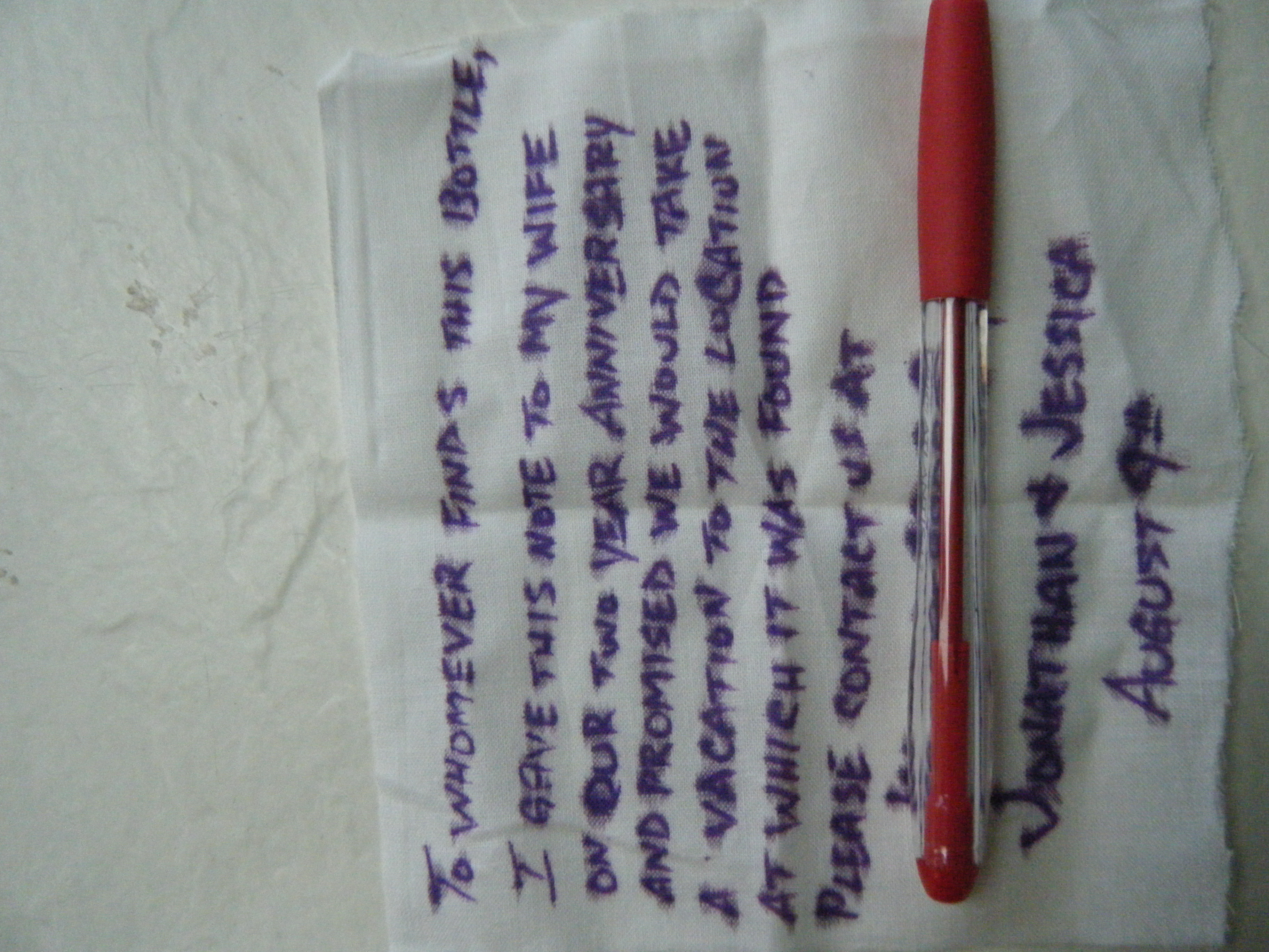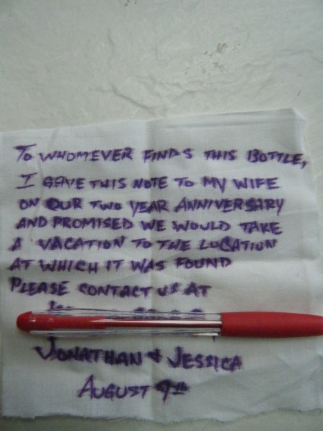 So three months later, and a bottle found, congrats Jonathan and Jessica!  Looks like you are headed to Pawleys Island, SC!  We live on the south end of Pawleys Island and that is where your bottle was found.  It’s a beautiful place here. If you have not been here you will enjoy your time here, I’m sure.